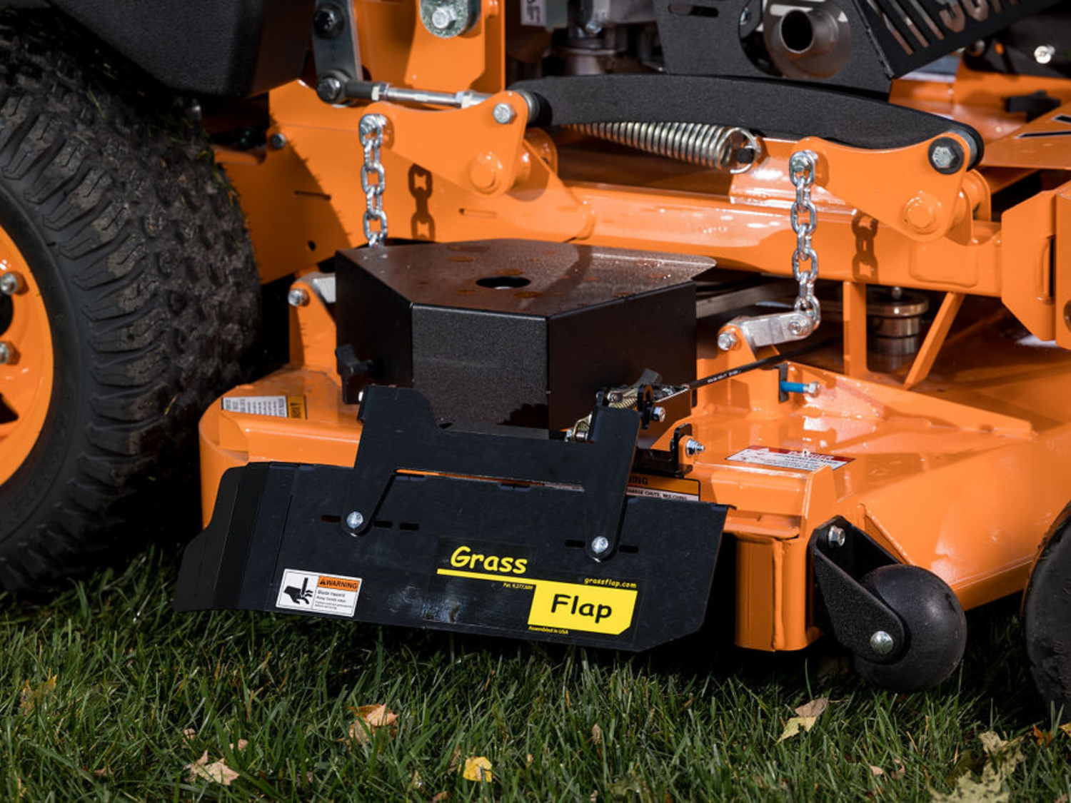 GrassFlap® chute blockers are foot-operated, Operator Controlled Discharge Chutes (OCDC) designed for zero turn lawn mowers. This attachment blocks the mower’s discharge chute to help create clean lines and edges while improving safety and control during mowing.